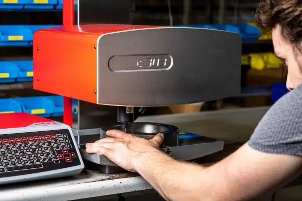 The C303 machine can engrave alphanumeric text, logos, or 2D Datamatrix codes.
